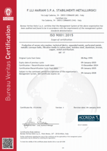 1995年、Fratelli Marianiは、SINCERT、その後ACCREDIAによって認定されたBVQI Italiaから規格ISO 9002:94の認証を取得しました。その後、品質システムは、法規制の進化に合わせて調整されました(ISO 9001:2000、ISO 9001:2008、ISO 9001:2015)。